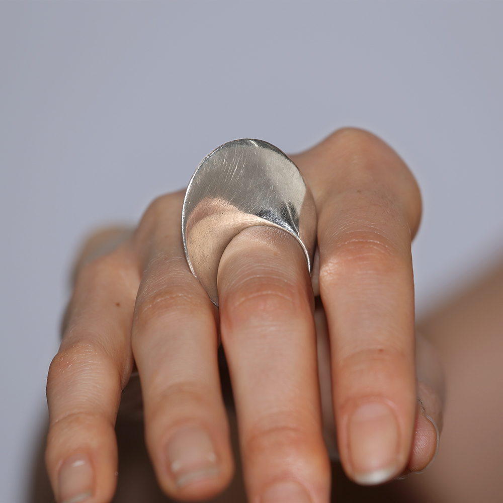 This represents the most iconic form of Serpentine, the möbius band it is based on. As a sculpture Coil reflects curved light from all angles of its sweeping circuit. Definitely an ostentatious piece with fluid, smooth edges, Coil is amazing to wear and play with, as a fidget.