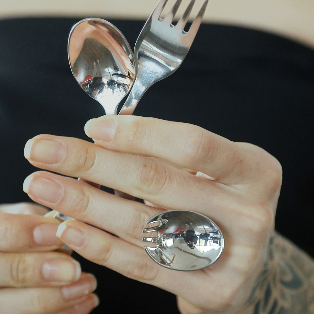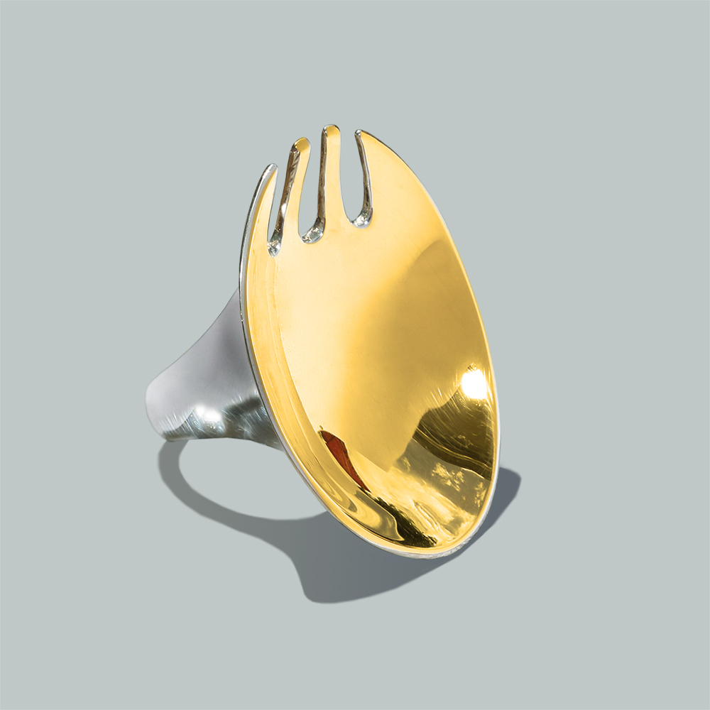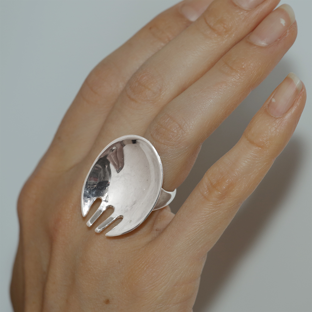 The infamous Spork, a fast food utensil invented some time after the Titanic. Fundamentally utillitarian designed for modern times (50ies) this ephemeral, ubiquitous object still ‘pokes fun-’ and occasionally still washes up on your sidewalk, or the beach. Yet, this Spork shines! Highly polished, like straight from the dishwasher, it wears like a charm. A guaranteed delicious conversation starter.